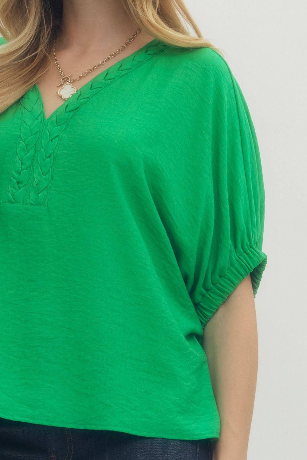 Solid dolman top featuring V-neck accent with trenza detail. Unlined. Woven. Non-sheer. Lightweight.